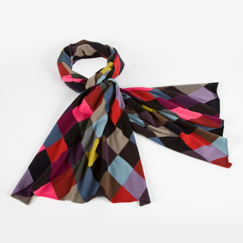 Paul Smith ha realizzato una meravigliosa sciarpa morbida e lunga, modello arlecchino multicolors a rombi, in tessuto a maglia in cashmere e lana con evidenti contrasti in giallo, rosa e viola e nero.