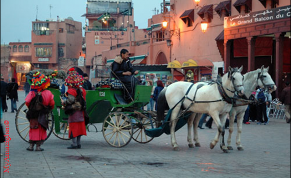 Sono 148 i calèches in servizio a Marrakech per visitare la città o semplicemente per recarsi nelle varie zone della Ville Rouge. Perchè tutto questo folklore perduri, una regolamentazione è stata messa a punto in questo ultimo anno, per migliorare il servizio e in primis per il benessere dei cavalli, motore di questa attività. Da oltre un secolo i calèches deambulano tra la medina storica e la “ville nouvelle”. Inizialmente servivano a trasportare esclusivamente la merce nei souks, con il tempo si sono trasformati in veri e propri taxi a quattro zampe. Questo servizio è oramai ad uso quasi esclusivo dei turisti ma è facile ancora imbattersi in calèches colmi di locali, che per 3 dh alla corsa,si fanno trasportare in certi derb della medina, come Derb Dabashi o alla stazione ferroviaria. Per un turista servono 120 dh per una bella galoppata in città, se vi spostate verso la Palmeraie calcolate altri 50 dh di supplemento; sono soldi ben spesi e una visita delle mura medioevali al tramonto, è indimenticabile. Se capitate all’alba, reduci da qualche nottata disco, a Bab Doukkala, vedrete una lunga e interminabile fila di calèches in attesa dei controlli delle autorità competenti, tutte le mattine dell’anno. Stato del veicolo, del conduttore e cosa importante lo stato di salute del cavallo, niente deve essere lasciato al caso. Per facilitare questo compito tutti i cavalli sono stati microchippati e i calessi dotati di pulci lettroniche con memorizzati il numero di serie, interventi richiesti, procedure, ecc… Nella città sono stati inseriti otto abbeveratoi con 8 corsie singole, per far si che in qualunche momento i cavalli possano dissetarsi, specialmente nel periodo di calura estiva di Marrakech, che non lascia scampo; si trovano sulla Place Jemaa el Fna, sulla Place de la Liberté, ai giardini Majorelle e davanti a diversi hôtels molti frequentati dai turisti. Un bel gesto dedicato a questi nobili animali che con il loro lavoro quotidiano perpetuano il ”movimento lento” marriakchi. Purtroppo la stessa sorte non tocca ai centinaia di asini, muli e cavalli, che quotidianamente trasportano merci in giro per la medina. Stracarichi all’inverosimile, il più delle volte piagati da quotidiane frustate per renderli più veloci e sovente malati. L’unica Associazione Nazionale (marocchina con aiuti inglesi) che si occupa di questa piaga è presente purtroppo raramente sulle strade e nei vicoli della medina, quindi, a mio giudizio inesistente. Ma di questo vi parlero’ in seguito tendendo presente che stessa sorte, se non peggiore, tocca alla moltitudine di cani randagi presenti sul territorio.