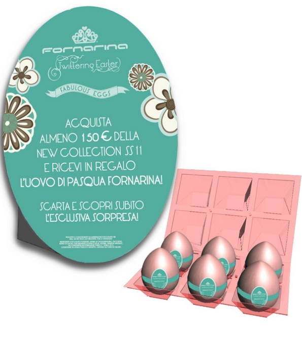 Fornarina festeggia la Pasqua con la dolce promozione Fabulous Eggs!Dal 12 al 25 aprile 2011, solo nei Fornarina Stores Italia, acquistando almeno 150 euro della Nuova Collezione Spring Summer 2011, si riceve in regalo l’uovo di Pasqua firmato Fornarina con all’interno una sorpresa ultra glamour! La nuova collezione propone strepitosi denim che delineano la silhouette con l’inconfondibile fit Fabulous Legs, trattamenti e lavaggi ricercati che mixano iper femminilità e streetwear culture.Twittering Easter @ Fornarina stores!