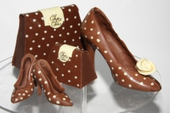 Choc Chic realizza Polka Dot, scarpe e borsette lavorate in cioccolato al latte con decorazioni di cioccolato bianco a pois, corredate di una rosa di cioccolato bianco che va a decorare la tomaia della scarpetta di grande dimensioni…