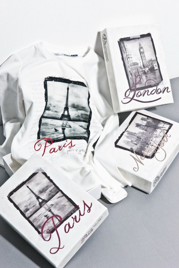 Tra le novità della prossima stagione Autunno Inverno 2011 di Take Two Teen, non passano inosservate le maxi t-shirt in cotone elasticizzato dedicate a tre delle principali capitali della moda. Una capsule collection che fa tappa a Parigi e a New York passando per Londra. Texture nei toni del bianco e nero e del seppia per t-shirts dal sapore retrò che ispirano viaggi ideali, e interventi di micro borchie ad impreziosire un mood casual. Ad enfatizzare l’atmosfera da cartolina, le stampe delle tre famose città sono accompagnate da uno sfondo di pensieri e dediche agli amici lontani. La cura per i dettagli che da sempre contraddistingue Take Two Teen si riversa anche nel packaging: le maxi t-shirt si presentano racchiuse ciascuna in una scatola ricoperta di carta ruvida ad effetto vintage la cui stampa svela il tema del contenuto. Ma il grazioso package non perde di vista la funzionalità: perché non riutilizzarlo come contenitore di vere cartoline?