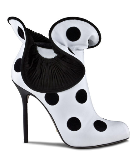 Quando ho visto la foto di questi stivali ho pensato subito al costume di Pierrot, credo dipenda dalla scelta cromatica ma soprattutto dagli enormi pois neri che decorano la pelle bianca.