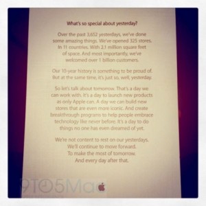 Quindi parliamo di domani. Il domani è il giorno in cui tutti noi lavoriamo. E’ il giorno del lancio di nuovi prodotti, come solo Apple può fare. E’ il giorno in cui costruiamo nuovi store che saranno ancora più iconici. E creeremo dei programmi di innovazione per aiutare le persone e far capire loro la tecnologia come mai prima. E’ il giorno in cui fare qualcosa che nessun altro si è neppure mai sognato di fare. Noi non siamo tra coloro che riposano sugli allori. Noi continueremo ad andare avanti. Per sfruttare al massimo domani. E ogni giorno dopo.”
