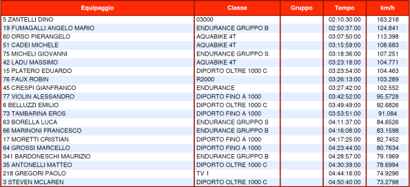 1) Dino Zantelli (classe 3000) in 02:10:30:00, media 163.218 km/h;