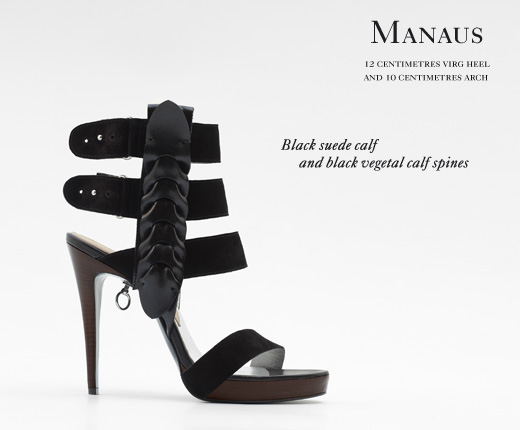 Il modello Manaus è realizzato in suede e pelle di vitello nera; il tacco misura 12 cm, ma con il plateau si scende a 10 cm di reale inclinazione; la parte anteriore è piuttosto semplice, protagonista assoluta è la caviglia, legata da tre maxi listini uniti tra loro da una decorazione in pelle nera, opaca, che crea un contrasto netto con il morbido suede, materiale più “dolce”. Immancabile l’anellino in acciaio posto sulla suola, simbolo di LaRare, piccolo vezzo che conferma l’atteggiamento provocatorio ma chic che si nasconde dietro queste calzature.