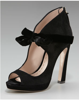 Da diverse stagioni le scarpe di Miu Miu sono entrate nel cuore di tutte noi, con la complicità di forme innovative, di una femminilità velata e dei materiali di lusso; uno dei modelli di punta per l’inverno 2011/2012 è una francesina spuntata in suede nero, chiusa da un fiocco in velluto che si chiude sul collo del piede.