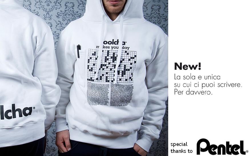 Ecco, ci parlavate della linea “Gioco” che ha avuto un grande successo a livello nazionale, grazie soprattutto alla collaborazione con Pentel. Ma fateci capire meglio, i capi li possiamo scrivere davvero?! “Sì. Sembra incredibile ma è davvero così! Grazie a Pentel, che ci ha fornito un particolare pennarello per tessuti, oggi Coolcha esce sul mercato con 4 grafiche legate al mondo dell’Enigmistica (Cruciverba, Unisci I Puntini, Colora i puntini e Rebus) dove i capi verranno venduti insieme a questo particolare pennarello, che verrà -volendo- portato con sè, grazie all’apposito taschino!”
