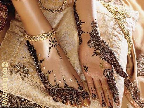 Naima è una “Hennaya“, lavoro ancestrale tramandatogli da sua madre ed ereditando questa passione osservandola sin da quando era bambina. Tutte e due le donne hanno fatto della Place Jemaa el Fna il loro luogo di lavoro quotidiano e imprescindibile. Dalle loro abili mani si compone il “Naqch beldi“, una ramage che ricorda ricami di altri tempi che le donne “Fassie” apprendono dalla più tenera infanzia; lo stesso motivo e decoro che viene utilizzato anche nell’architettura tradizionale o dai maestri artigiani che lavorano il cuoio, il legno o ancora il gesso. Matisse, durante il suo soggiorno in Marocco, restò fortemente impressionato dalla bellezza di queste vere e proprie opere d’arte. Molte delle sue opere dipinte in Marocco rappresentano paesaggi mediterranei molto colorati come “I Paraventi moreschi” o “Zorah” e in queste opere sono ben rappresentati i lavori delle Hennayat. Ma quello che sorprende ancor più di queste donne è l’impressionante velocità a creare un vero quadro sulla pelle con una semplice mistura di foglie verdi scuro. Queste piccole foglie di henné (una varietà di sedano), seccate e trattate con del succo di limone e acqua calda producono una materia untuosa dove il colore puo’ essere intensificato aggiungendo altri ingredienti: segreto custodito gelosamente da ogni tatuatrice. Da secoli, la cerimonia di posa dell’henné è festeggiato come si deve dalle donne marocchine. Questa piccola festa dà luogo ad inviti ai parenti, agli amici e, durante il lavoro, si offre the e pasticcini agli invitati. Il rituale è accompagnato da canti, da poesie e tanta musica, secondo tradizione: un reale piacere che distende gli animi. Purtroppo però i tempi sono cambiati e anche le donne (nelle metropoli) non hanno molto tempo a disposizione e quindi i tatuaggi con l’Henné devono essere rapidi e belli; si rinuncia alla festa ma non al tatuaggio, simbolo profondo di seduzione femminile. Gli utensili usati dalle Hennayat si sono ugualmente evoluti.Jadis, un artista dell’henné utilizza dei bastoncini di legno sottilissimi che creano, con la sua bravura, linee , finissime croci e geometrie. Oggi la maggiorparte delle tatuatrici usa ancora delle siringhe di calibro diverso e, con una precisione incredibile, tracciano i loro disegni. I piedi e le mani sono mantenuti sospesi, sino al momento in cui il prodotto secca. Poi, con un tessuto inbevuto di succo di limone, aglio, pepe e zucchero, il tatuaggio viene tamponato e il giorno successivo viene rimossa la crosta con dell’olio di oliva. E’ quindi con grande precisione che Naima e le sue consorelle tatuatrici abbelliscono la pelle femminile utilizzando diversi motivi come animali, piante e fiori, specialmente nelle feste come matrimoni, battesimi oppure pellegrinaggi o semplicemente la vigilia di un Aïd (festa). IlRamadan è in egual misura un mese di lavoro impegnativo, in particolare laNotte del destino. Le Hennayat non sono solo sinonimo di festa ma anche durante i momenti tristi sono presenti con il loro lavoro. Se non può essere applicato alla vedova durante il periodo del lutto, dal 7° al 40° giorno, l’henné in pasta, circola nelle assemblee, tra i familiari, affinchè tutti lo possano toccare, segnale finale dell’autorizzazione alla vedova ad utilizzarlo nuovamente. Altro luogo di henné sono i Santuari o i Mausolei. Questi ultimi lo propongono come una sorta di rituale necessario prima dell’ingresso per rendere onore al santo e può essere svolto nello spazio sacro della Koubba; in questo caso l’henné è un legame spirituale, profondo, un vero atto di fede. La maggioranza di queste visitatrici sono persone con problemi, disperate, e cercano un conforto, pensando che il Marabout (Santo) gli darà un sostegno morale. Nel momento che la Hennaya procede alla posa in opera del tatuaggio, decorando le mani e i pedi, gratifica il morale, donando momenti di serenità. Dopo questo rito sarà possibile toccare il santo sino al momento dell’ispirazione, della risoluzione del problema. E’ dentro a questi luoghi sacri che gli uomini e le donne possono coabitare, senza nessun tipo di interdizione e tabù. Nella Koubba ci si dimentica delledifferenze e si pensa solamente a pregare e a raggiungere l’anima. Un riposo spirituale e una beatitudine che parte dall’henné, applicato dalle mani esperte di una Hennaya, con gesti mirati e precisi, rinnovando, nel tempo, un arte e una tradizione che resiste ai tempi e alle mode.