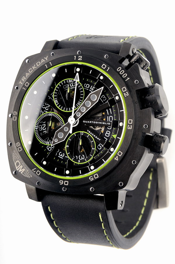 E’ sempre ricorrente il forte richiamo al mondo dello sport e delle corse all’interno della collezione di Quarto di Miglio ed anche il modello TRACKDAY lo conferma. Un cronografo con un design all’avanguardia che suscita passione, energia e forte temperamento.