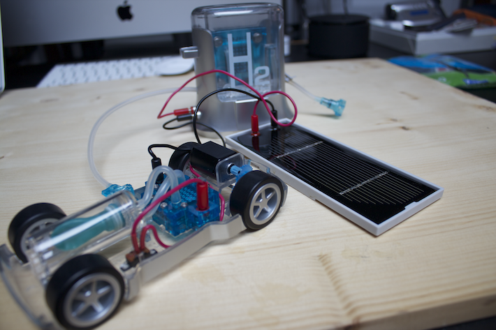 Prima di vedere però i prodotti più interessanti di questo negozio, vorrei spiegare in pochi secondi come funziona una cella a combustibile e come è possibile produrre l’idrogeno, un’energia rinnovabile che deriva dall’acqua, già utilizzano in molte automobili. Per farlo utilizzerò l’immagine qui sotto. Quello che vedete qui sotto è uno dei primi prodotti di H2Planet, l’H-Racer, che ho acquistato circa 4 anni fa. Si tratta della macchina ad idrogeno più piccola al mondo. Ora non è più funzionante in quanto una cella a combustibile, se rimane inutilizzata per molto tempo rischia di compromettere la sua efficacia.