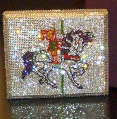 Parliamo di una speciale borsetta tempestata da cristalli Swarovski; un insieme di oltre 3000 pietre luccicanti, di colori diversi, che formano, vista la loro esclusiva composizione, il logo del Festival, che da anni è rappresentato da un bimbo su un cavallo del carosello.