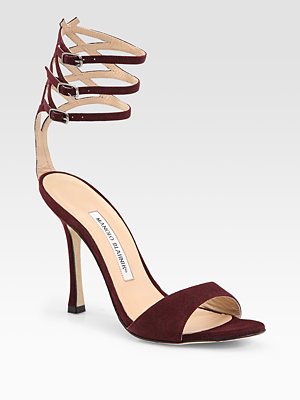 Realizzati in suede rosso scuro, hanno una forma piuttosto semplice, a dargli carattere sono i tre cinturini che risalgono la caviglia, ed è questo dettaglio, che in generale adoro, a lasciarmi perplessa, perché in questo caso arrivano molto in alto sul polpaccio; questo significa due cose: per indossarli con stile servono delle gambe infinite, ma soprattutto è difficile abbinarli senza spegnerli. I pantaloni sono out, le gonne al ginocchio richiedono le suddette gambe chilometriche, quindi, cosa rimane? Mini abiti e gonnelline da ballerina? Non ne sono sicura, attendo di vederli indossati da qualche celeb, sperando che nessuna decida di mortificarli sotto un lungo abito da sera.