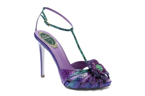 Il modello è molto semplice, è la scelta cromatica ad avermi conquistata, mi piange il cuore a dirlo ma le tonalità di viola e verdi vibrano in modo particolare sulla pelle di pitone, se avessi la possibilità commissionerei al mio amato René un sandalo identico ma in ecopelle, non sarebbe fantastico? Importante la broche gioiello a forma di fiore appuntata sulla tomaia, che richiama i colori della pelle: non avrò mai il coraggio di infilare il piedino in questo sandalo, ma trovo che sia originale e davvero molto chic, una ventata di freschezza in un panorama di tacchi massicci e calzature da trampoliere.