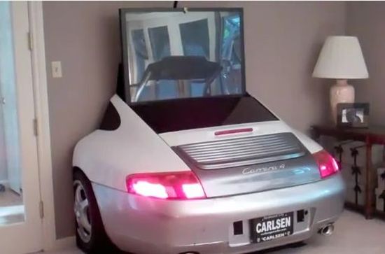 Quello che vedete è un sistema multimediale su base Porsche 911 modello 996, dallla quale esce un monitor di 42 pollici con due casse incorporate nella griglia del cofano; i fari lampeggiati e la targa personalizzata, danno un ulteriore tocco di originalità a questo particolare immobile.