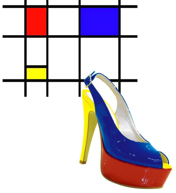 Famosissimi, i quadri di Mondrian dimostrano una complessità che smentisce la loro apparente semplicità. Tipiche forme rettangolari di rosso, giallo, blu e nero, come i colori scelti da miss roberta per i sandali opentoe dal tacco vertiginoso, con plateau altissimo, pelle verniciata, scarpe come opere d’arte!!