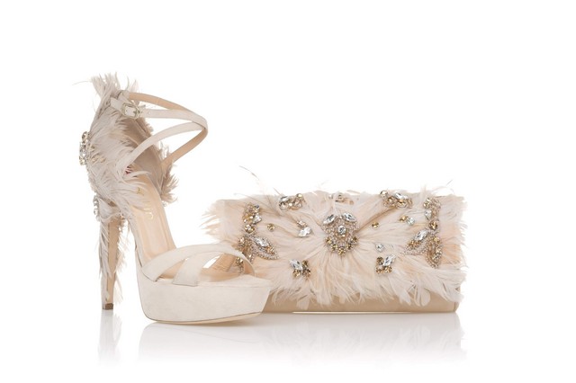 Si tratta di un sandalo con platform vistoso realizzato in pelle color cipria chiaro, tacco e tallone sono decorati con candide piume e vistosi gioielli ispirati dai celebri monili di Elisabetta II, tra i più preziosi del mondo; la pochette rigida si abbina alla perfezione ad un sandalo che forse sarebbe più adatto allo spirito glam di Kate Middleton che a quello della tostissima sovrana.