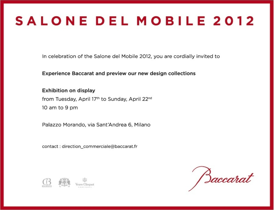 Milano, aprile 2012 – Per il Salone del Mobile 2012, dal 17 al 22 aprile, Baccarat si presenta a Palazzo Morando-Museo della Moda Costume e Immagine di Via Sant’Andrea 6. All’interno, per la prima volta, un B bar, un locale temporaneo sofisticato e accogliente dove tra musica, intrattenimento live e dj set, luci di cristallo e atmosfere cool, sarà possibile degustare champagne, vini e cocktail nei bicchieri che da sempre simboleggiano l’art de vivre “à la Baccarat”.