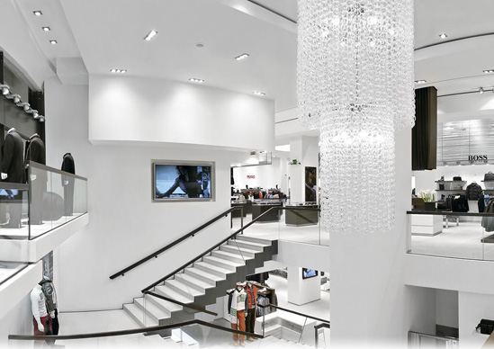 Il famoso marchio Hugo Boss apre il nuovo flagship store direttamente sugli Champs-Elysées a Parigi su uno spazio di 1.229 metri quadrati per esporre le sue collezioni in un ambiente raffinato total white circondato da pannelli corredati di struttura con schermi a led giganti nei quali verranno trasmessi fash dalle sfilate e illumintato da enormi lampadari disseminati da fili d’argento e vetro cristallo. Al pianterreno si estende uno spazio ampio dedicato completamente agli accessori mentre al piano terra verrà ospitata la moda femminile e la linea Green, dedicata allo sportswear e al mondo del golf. Il mezzanino é stato predisposto per Orange mentre nel basement si concretizzerà l’uomo con Black e Selection.