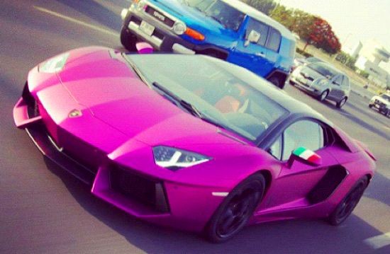 Per le strade di Dubai, è stata filmata in questi giorni una particolare Lamborghini Aventador LP 700-4 verniciata con una strana tinta di colore viola, con specchietti retrovisori rivestiti da una bandiera italiana.