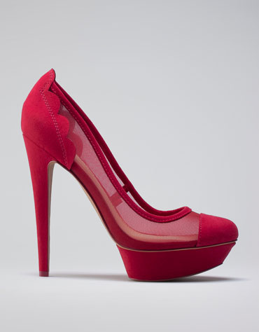 La forma di queste pumps è pulita e rigorosa, nonostante la presenza di un plateau notevole, leggermente all’insu’, ispirato alle creazioni di Charlotte Olympia. Il plaftorm, come il cap toe, il tacco e il tallone sono realizzati in un tessuto simile al faux suede rosso ciliegia, una tonalità adatta alle stagioni fredde, in quanto rende al massimo sulle pelli più chiare; il resto della tomaia è invece composto da un tessuto a rete della stessa tonalità, che mette in mostra gran parte del piede: impossibile indossare le calze con un modello del genere, l’effetto della doppia rete sarebbe inguardabile, così come le cuciture del nylon nascoste malamente sotto la tomaia. A parte questo, devo ammettere che questa scarpa mi intriga e mi incuriosisce: non dico che mi piace perché dovrei provarla, per vedere quanto mette in mostra e in che modo, ma l’idea ispira simpatia, anche se non sono scarpe da indossare al lavoro o per una passeggiata al centro commerciale!