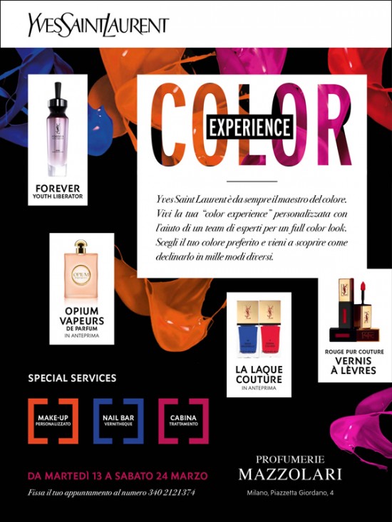 Dal 13 marzo fino al 24 la profumeria Mazzolari in Piazzetta Giordano 4 a Milano offre l’opportunità di Make Up alle appassionate che in questi dieci giorni si prenoteranno data la presenza dei make up artist Yves Saint Laurent per insegnare a usare i colori a seconda della vostra personalità. L’iniziativa si chiama Color Experience, un viaggio nelle nuance glamour della nuova stagione make up di YSL.