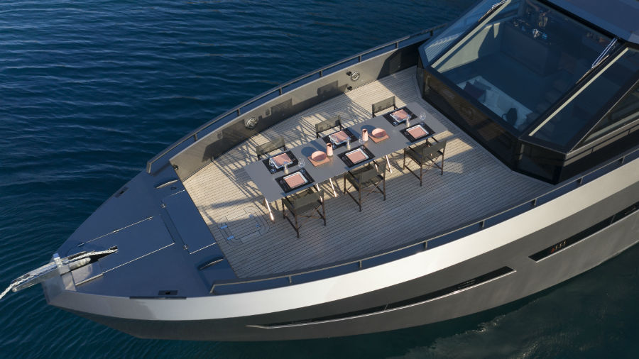 “Multifunctional design was very important for the owner,” continues Yukay. “In fact, the open foredeck has three different uses: as a sunbathing area, a dining area for 12 people, and a screen can be set up to turn it into an open-air cinema.”