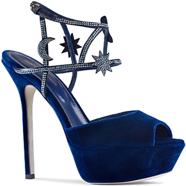 L’idea che Fransceso Russo stia esagerando con i plateau rimane, ma passa in secondo piano davanti alla bellezza del velluto blu che compone questi sandali: forse non l’ho mai scritto, ma adoro le scarpe in velluto, porpora o blu, ne sogno un paio da anni, ha quella delicata voluttuosità che nessun altro tessuto può dare, al tatto e alla vista. In questo modello poi c’è anche una decorazione gioiello vagamente esoterica, a mio avviso splendida.