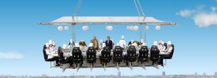 Dinner in the sky è un ristorante fantastico da ogni punto di vista: di sicuro salta subito all’occhio che si mangia sospesi in aria da una grù a circa 60 metri di altezza; ma il bello è che questo “ristorante volante” si può affittare e portare in ogni città!!