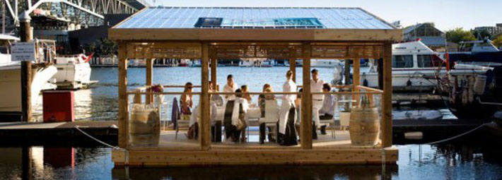 Plastic Dining Room (Vancouver) è un ristorante orientato all’ecologia. Infatti è alimentato da dei pannelli solari e galleggia grazie a 1675 bottiglie di plastica!