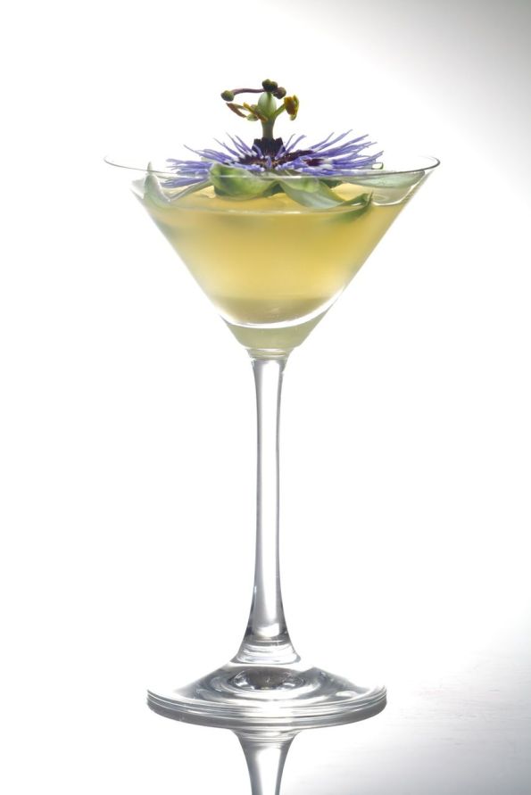 Shakerare con energia e filtrare. Servire in coppa cocktail e decorare con fiore di frutto della passione.