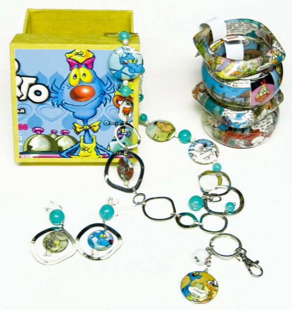 Bangles , orecchini e collane create con il riutilizzo dei fumetti che le edicole non hanno venduto. Ed ecco i fogli dei fumetti di Diabolik vetrificati diventare originali bijoux , tutti diversi, tutti unici come l’amore.