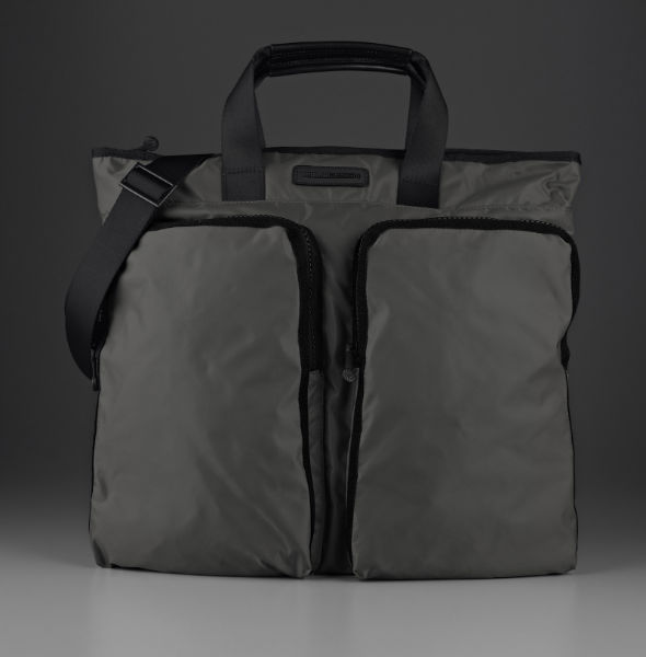 Realizzata in nylon idrorepellente declinato in due sfumature, nero e grigio piombo, ha due tasconi applicati chiusi da zip che possono racchiudere ogni device tecnologico dall’Ipad allo smartphone, manici rinforzati per trasportarla a mano e una tracolla allungabile per portarla comodamente a spalla.