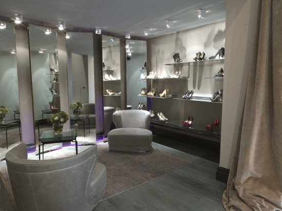 La zona anteriore si avvale di particolari mensole in ottone lucido che dal soffitto scivolano verso il basso quasi rivestendo le pareti di fondo dal quale prendono corposità; la zona alcova, nascosta dal tendaggio divisorio, presenta le calzature più importanti per la sera o la cerimonia, mentre l’intero ambiente si correda di spazi e ambienti distinti creati mediante l’ausilio di luci teatrali di grande effetto proiettanti sfumature colorate e ammiccanti adatte a trasmettere quella sensazione intrinseca di innovazione e femminilità tipica della filosofia del marchio.