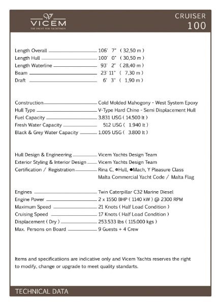 Power arrangements are 2 x CAT C32 1 ,550HP Marine diesel engines, which allow the 100 Cruiser to reach cruising and maximum speeds of 1 7 and 21 knots, respectively. The fuel tanks have a capacity of 3,831 gal. 14,500 lt. while the water and holding tanks are 512 gal. – 1,940 lt. and 1,025 gal. – 3,800 lt., respectively.