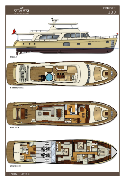 “The Vicem 100 Cruiser is an ideal yacht for an owner with a large family or a heck of a lot of friends – says Dirk Boehmer, Vicem Yachts USA President. “A yacht of this size can accommodate 3 couples with full VIP accommodations and an additional 4 guests in two separate staterooms, providing the discerning yachtsmen an experience that cannot be duplicated on a fiberglass vessel. With a draft of only 6’3” (1.90m), its cruising ability in the Caribbean, as well as in the Mediterranean, will provide an experience only our Flagship Vintage model can bestow on those aboard. We are very proud to introduce the Vicem 100 on our 20th Anniversary. It is a true testament to Vicem’s capabilities.”